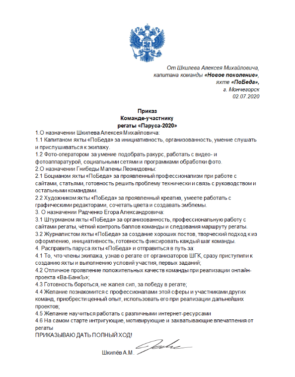 Погода сегодня хорошая, три балла, лёгкий ветерок. Команда в приподнятом настроении